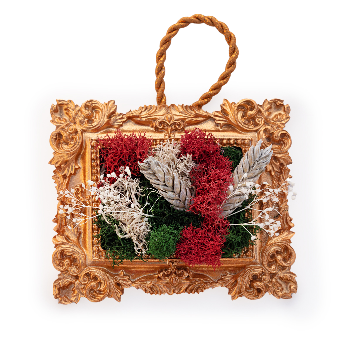 Materials: Preserved reindeer moss (deep green, ivory, crimson), natural wheat accents, dried florals, ornate vintage-style gold frame, braided hanger