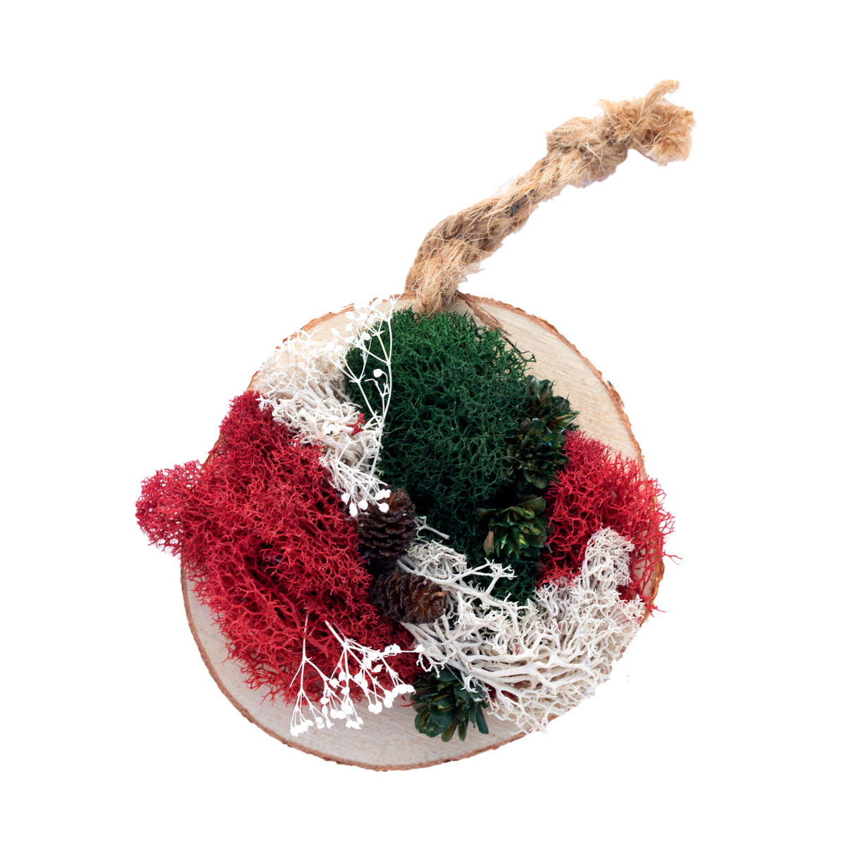 Materials: Preserved reindeer moss (evergreen, crimson, ivory), natural pinecones, dried botanical accents, natural wood slice base