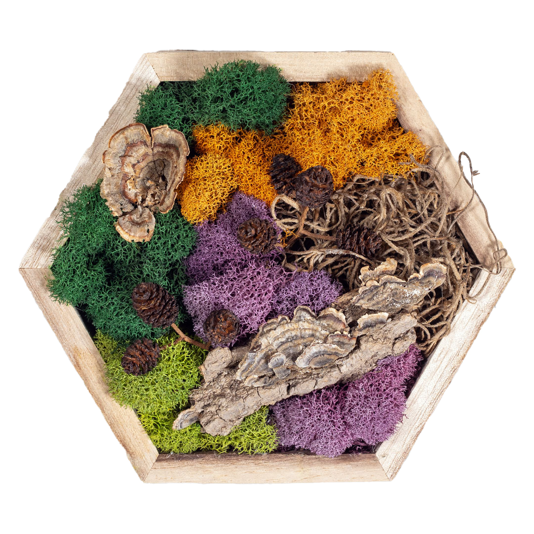 Materials: Preserved reindeer moss, natural bark, mini pinecones, dried woodland fibers, wooden frame