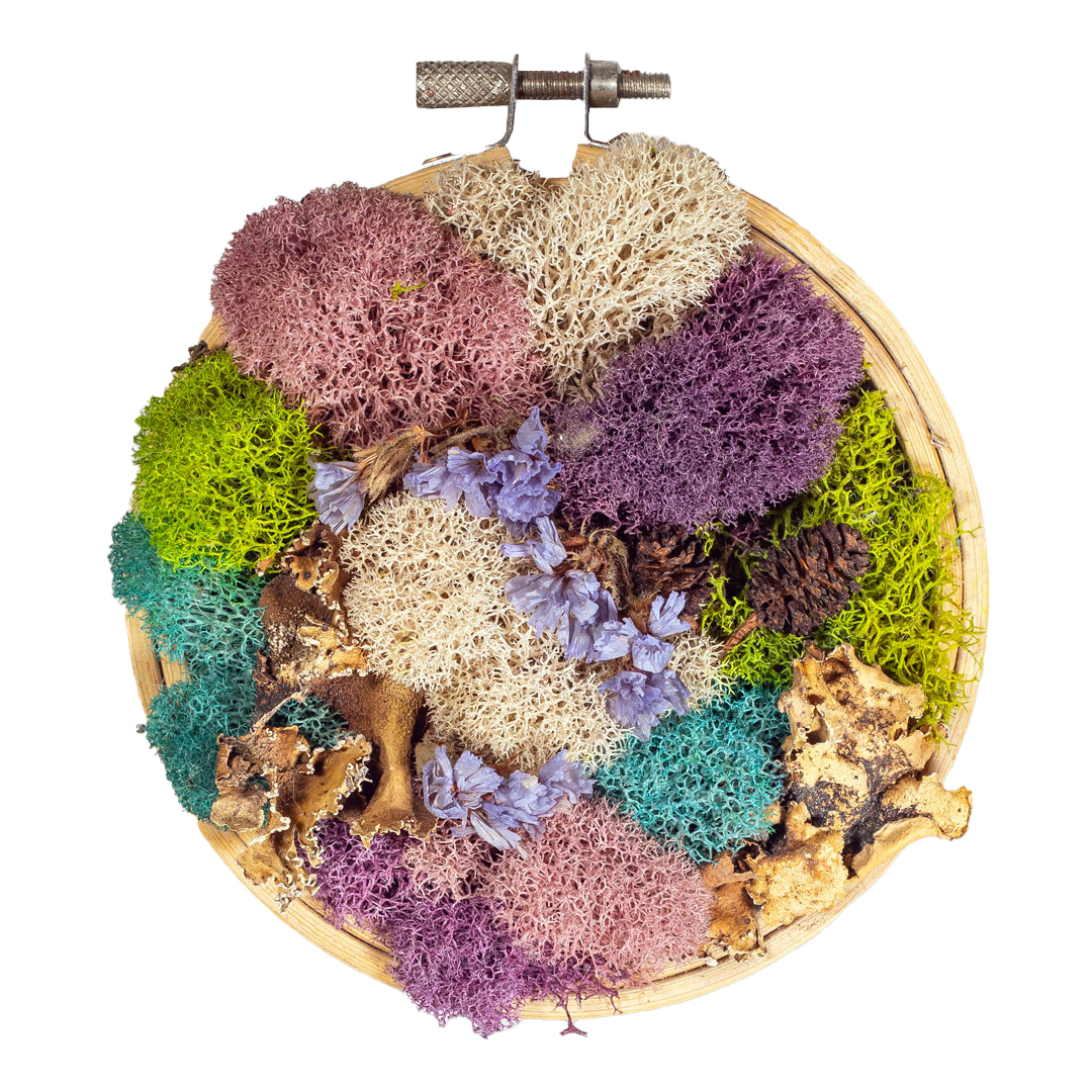 Materials: Preserved reindeer moss, dried florals, bark, small pinecones, embroidery hoop frame