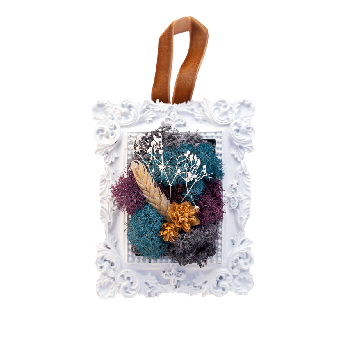 Materials: Preserved reindeer moss (teal, plum, gray), natural wheat accent, dried floral elements, ornate vintage-style white frame, velvet ribbon hanger