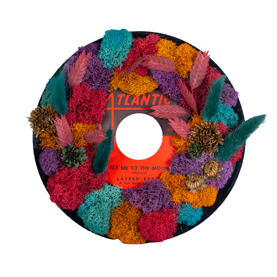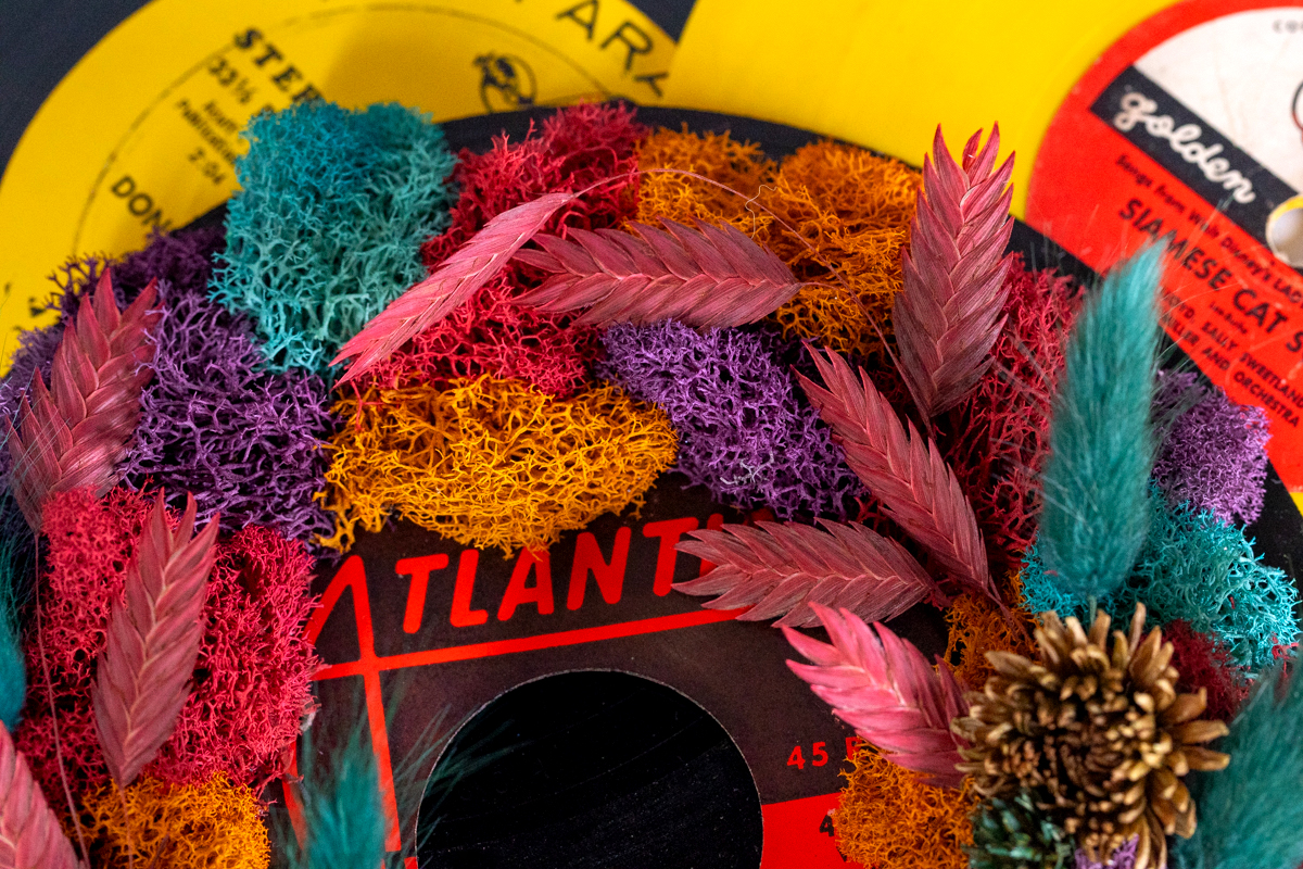 Materials: Preserved reindeer moss (teal, crimson, marigold, plum), dried florals, natural botanicals, authentic vinyl record