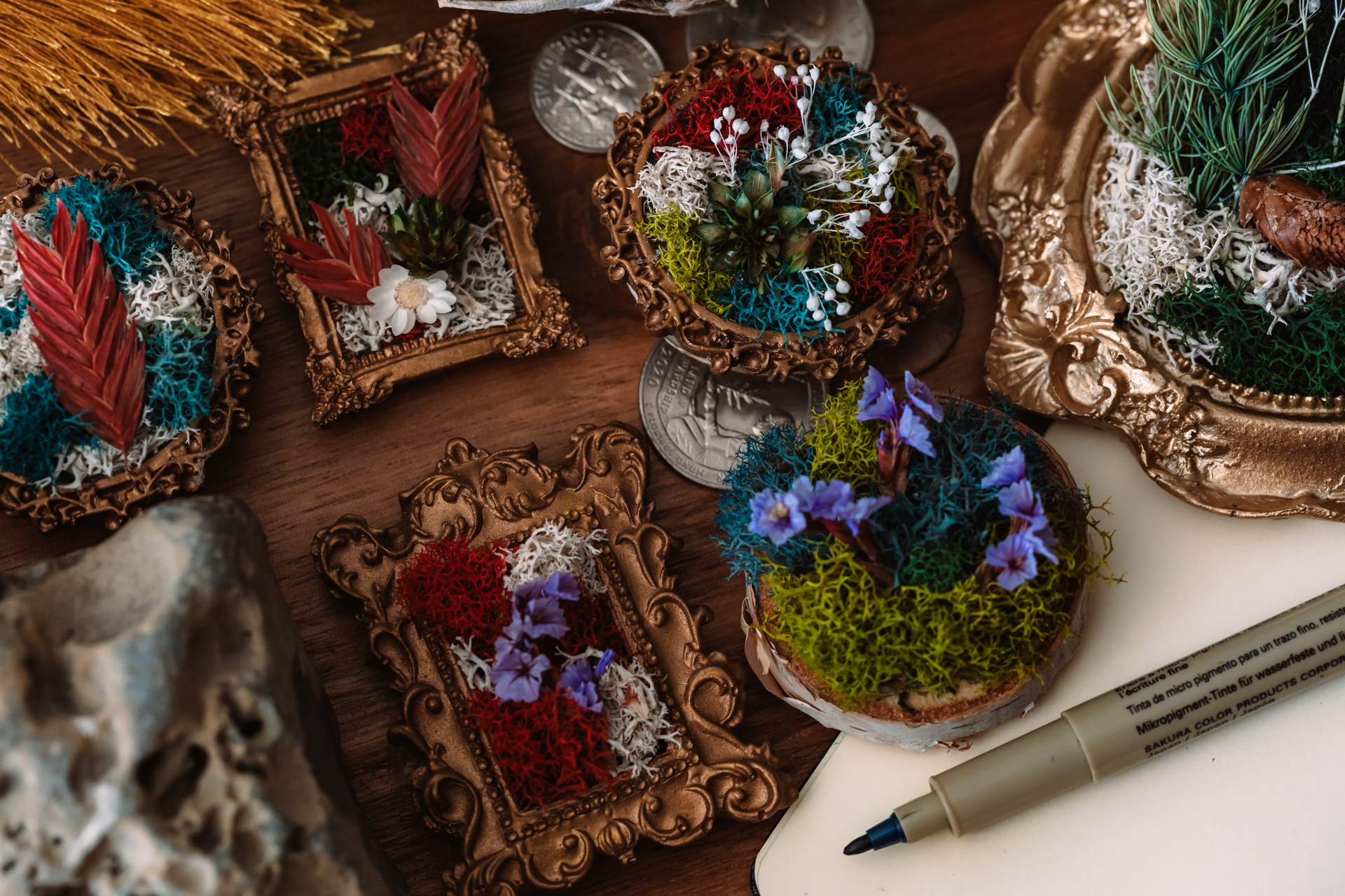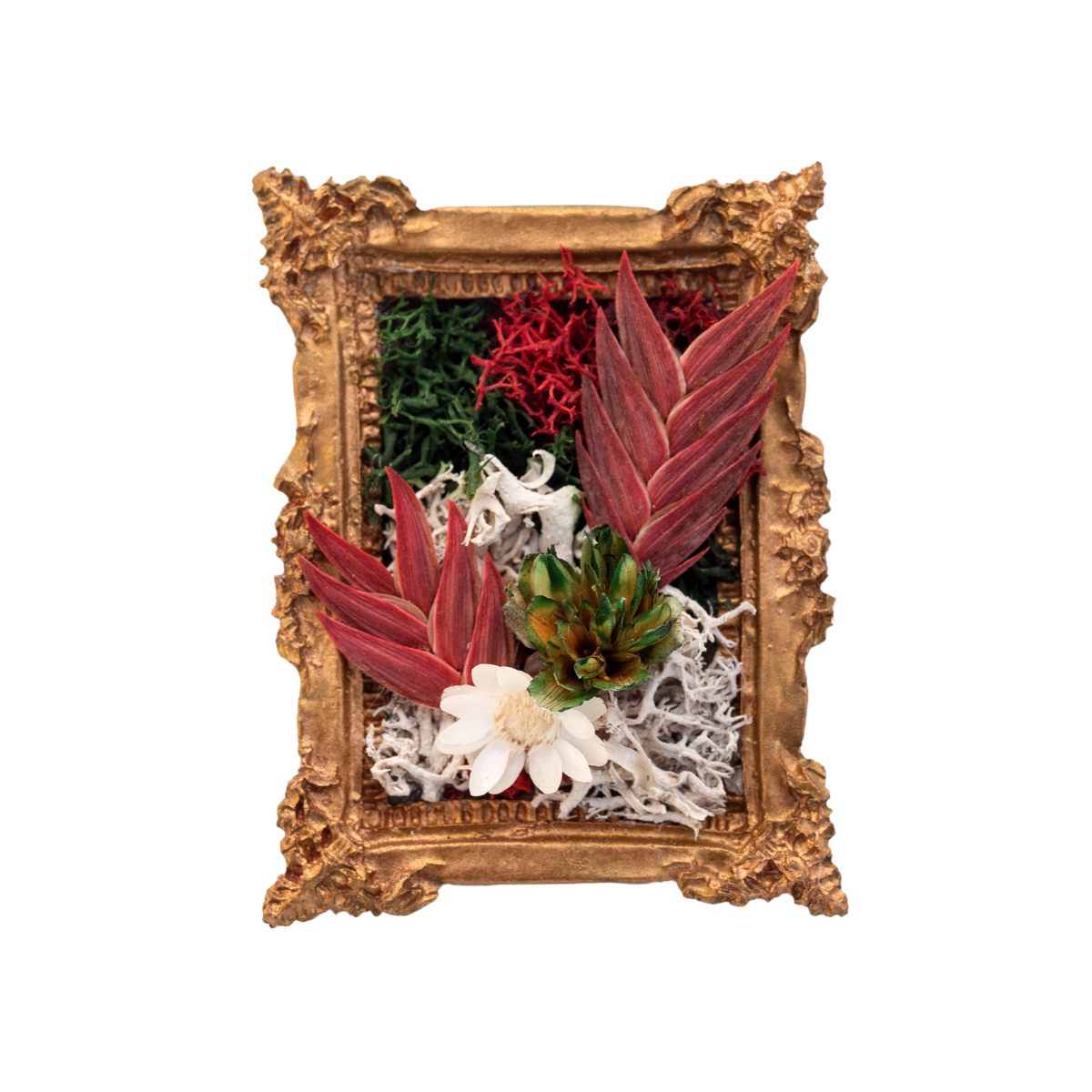 Materials: Preserved reindeer moss, preserved botanical accents, dried floral elements, ornate vintage-style mini frame