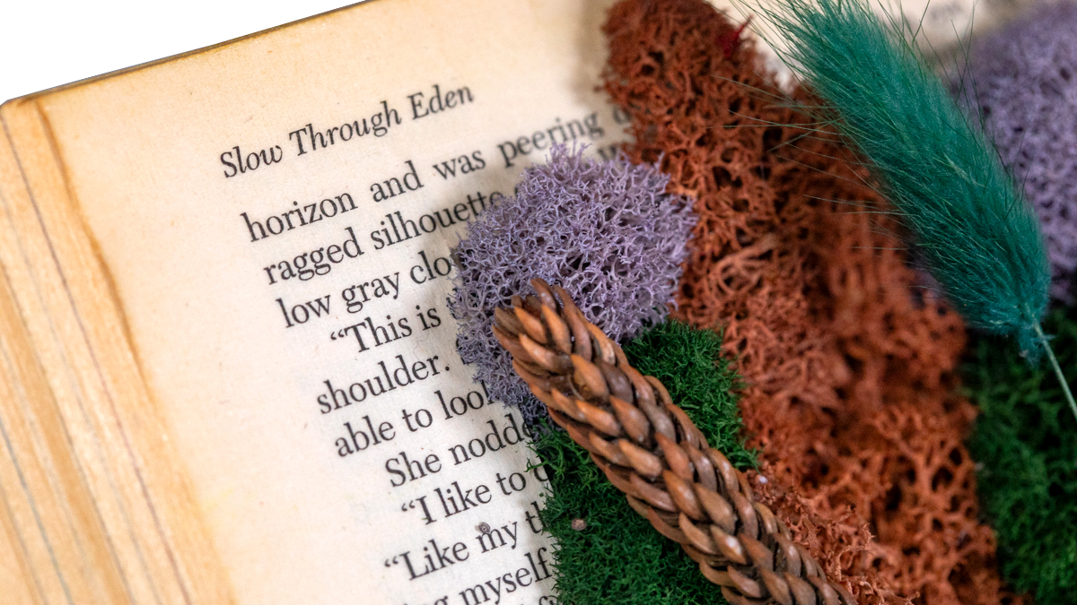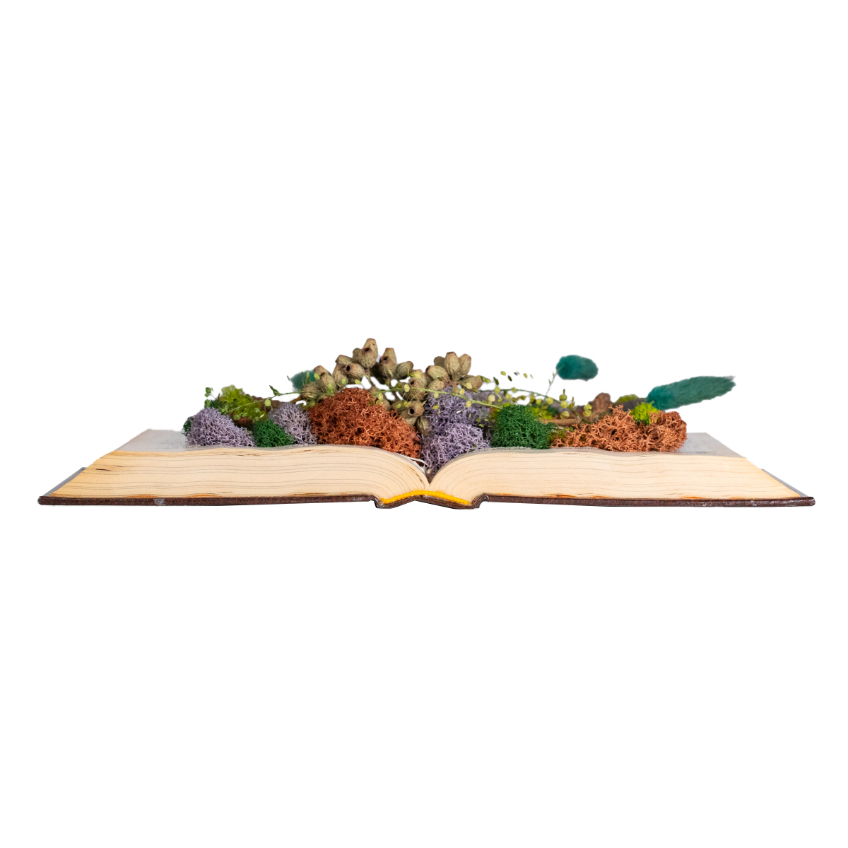 Materials: Preserved reindeer moss (forest green, chartreuse, brown, gray), dried botanicals, braided wheat, natural elements, vintage book