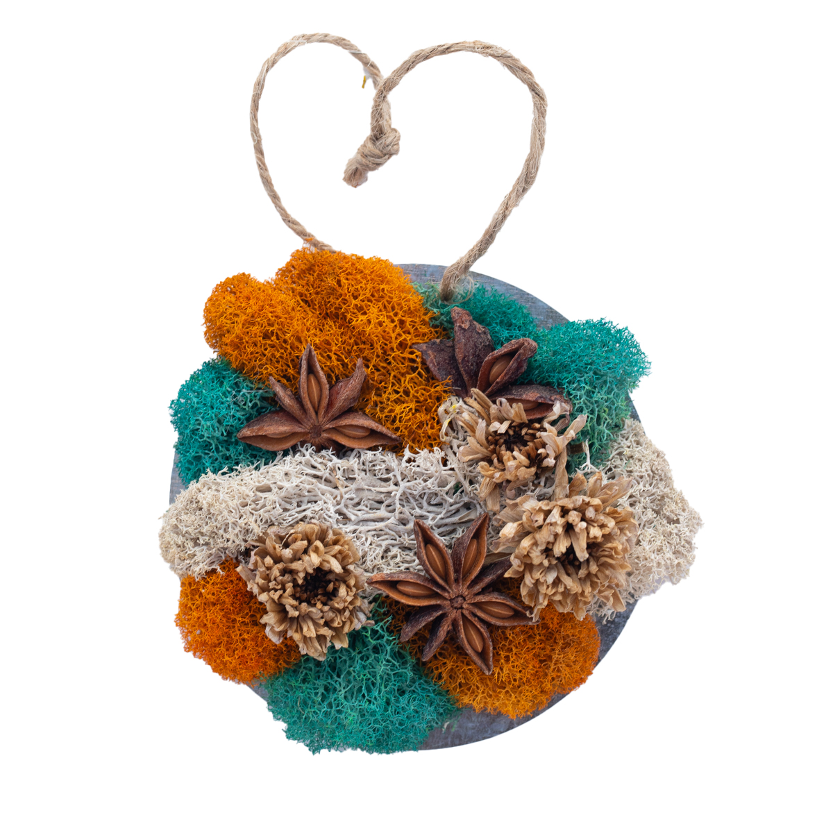 Materials: Preserved reindeer moss (amber, teal, ivory), natural star anise, dried floral accents, botanical elements, round wood base
