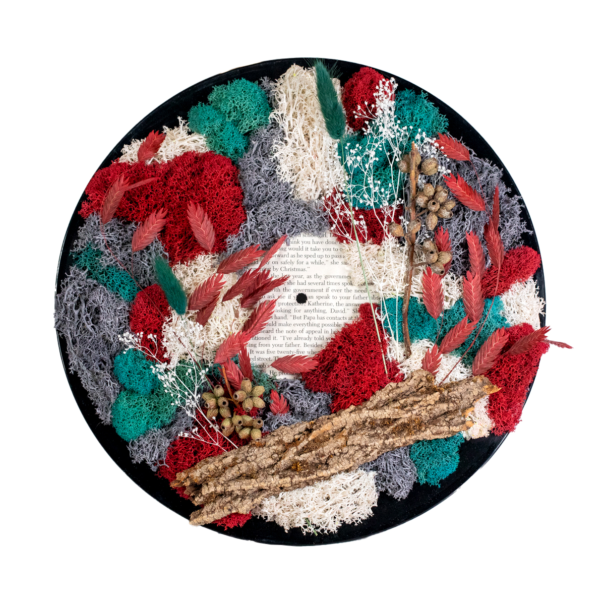 Materials: Preserved reindeer moss (crimson, emerald, ivory, gray), natural bark, dried botanicals, vintage vinyl record